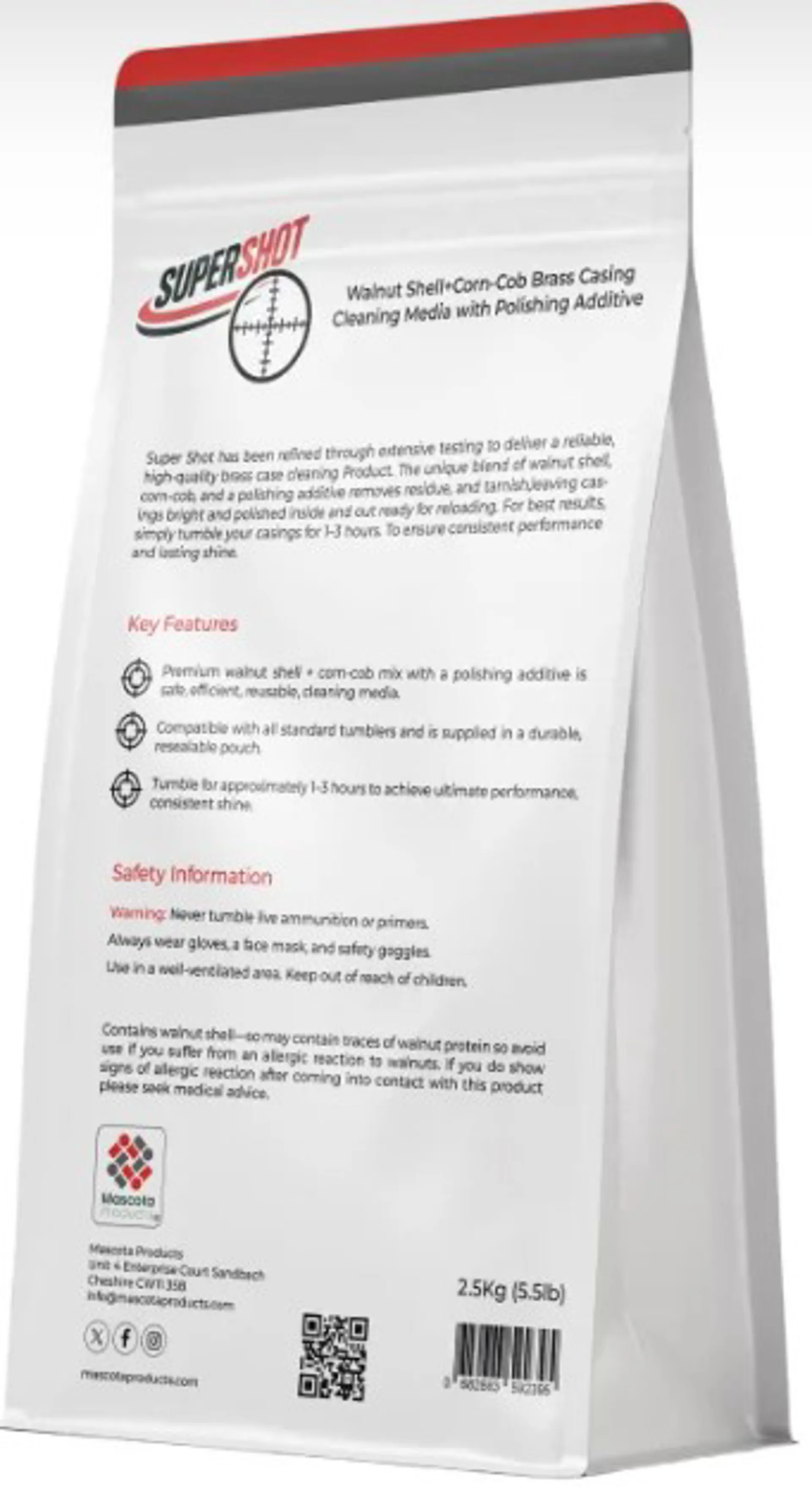 After careful trials and experiments with brass casings, Super Shot has been perfected the ultimate cleaning performance. Made from premium walnut shell and corn-cob with a polishing additive, it safely and efficiently tumbling Media for cleaning brass casings, leaving them spotless and ready for reloading. Every batch has been tested extensively to ensure consistent results and to prolong Shine with your brass. Simply tumble your spent casings for 1–3 hours for optimal results. Please always wear gloves, a face mask, and safety goggles when using. Contains walnut shell — avoid if you are allergic to walnut. NEVER tumble live ammunition or primers. Super Shot is the trusted choice for hobbyists and professional reloaders seeking reliable, high-quality brass cleaning Product.