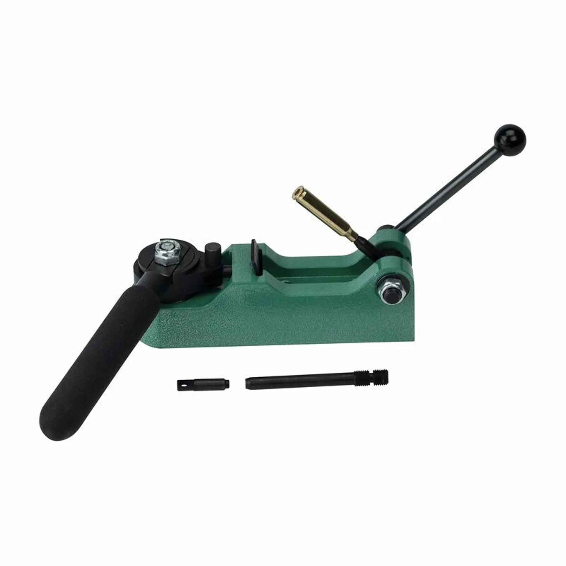 This dedicated bench mounted Primer Pocket Swager Tool makes removal of primer pocket staking/crimp a simple task. This has become especially important due to the popularity of AR-platform rifles, which has resulted in much commercial ammunition having staked primer pockets. The rugged die cast aluminum base, hardened steel cam and foam padded grip handle require 35-percent less force than other tools to complete the job.