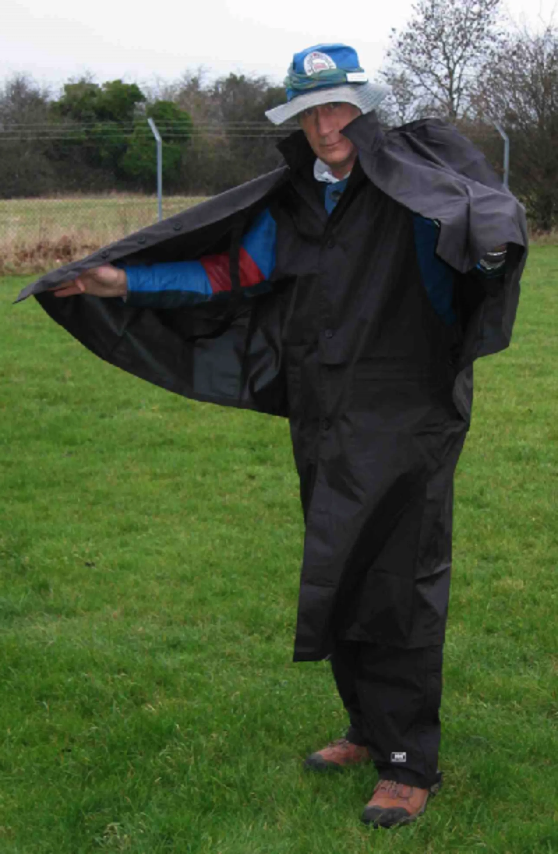 The ultimate shooters all weather cape. Really 2 capes in one. Made from reinforced nylon, the inner part is a waistcoat type fitting which covers the torso and legs and allows free arm movement. The outer part is a roomy shoulder cape that covers the arms and protects the shoulders. Includes an optional button-on hood. Available in S, M, L and XL and Black only.